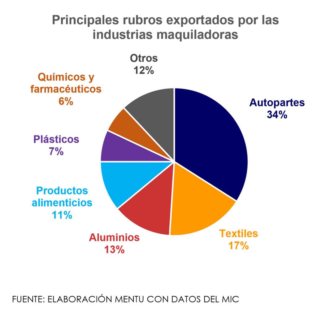 Los principales rubros exportados por las industrias maquiladoras fueron autopartes (34%), confecciones y textiles (17%), aluminios (13%), productos alimenticios (11%) y plásticos (7%), concentrando el 82% de los envíos. Los países del Mercosur son los principales destinos de los productos de este régimen, liderados por Brasil con el 64% de las exportaciones, seguido de Argentina (15%). Fuera de la región, Países Bajos y EE.UU. son los principales destinos (4%).