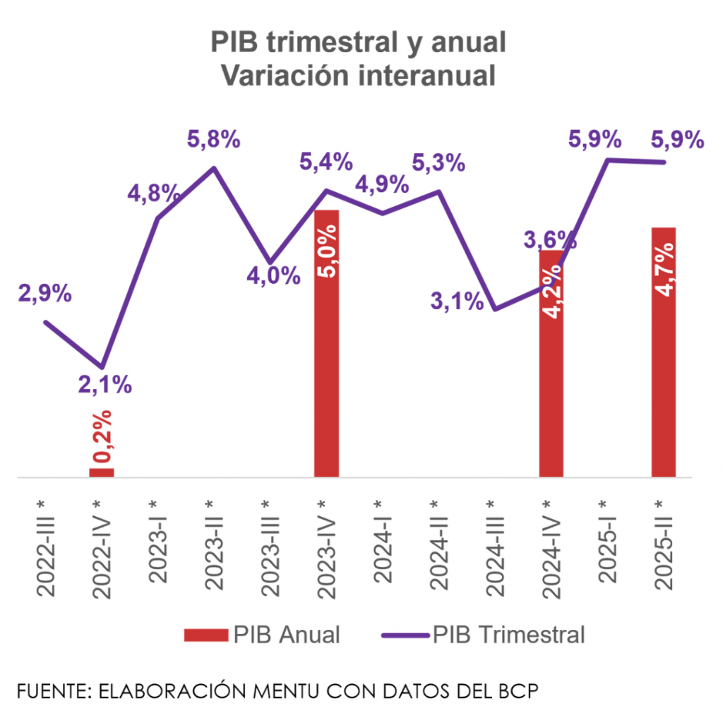 En el segundo trimestre de 2025, el PIB se incrementó 5,9% interanualmente. La agricultura se contrajo 3,1% por la menor producción de soja, parcialmente compensada por mayores volúmenes de maíz, arroz, algodón, girasol, poroto y sésamo. En contraste, ganadería, forestal, pesca y minería crecieron 4,8%, con más faena de bovinos, aves y cerdos y mejor desempeño minero asociado a la construcción.