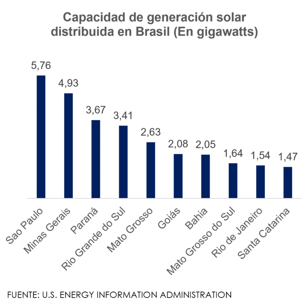 Actualmente, la energía solar representa el 23% de la capacidad eléctrica total de Brasil. São Paulo lidera el ranking regional, seguido por Minas Gerais y Paraná. Aunque existen 122 GW de proyectos solares planificados, solo 6 GW están en construcción, lo que podría significar una menor velocidad de expansión.
