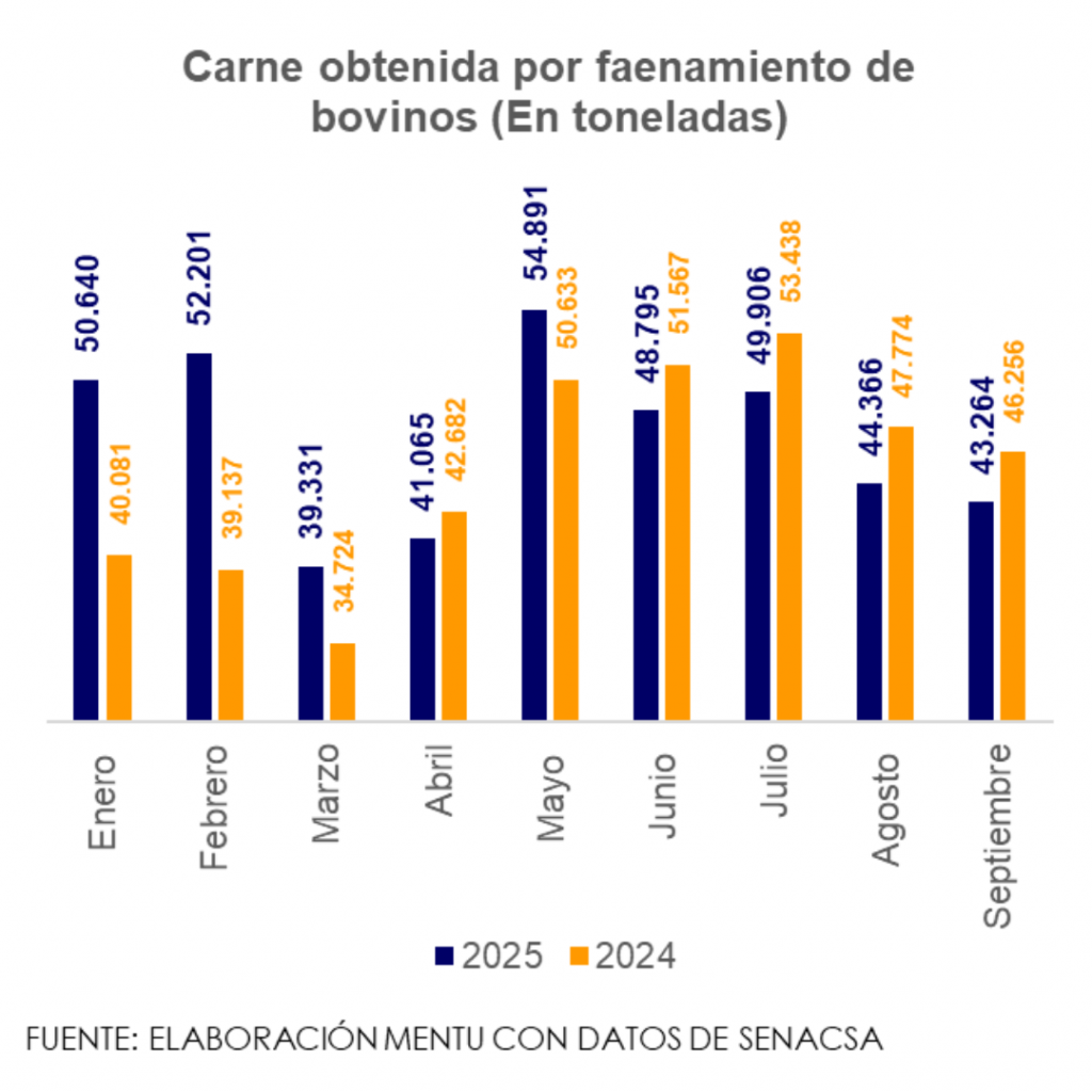 En septiembre, los frigoríficos faenaron 174.348 cabezas de ganado, de las que se obtuvieron 43.264 toneladas de carne. En relación con septiembre del 2024, se registra una disminución de 11.693 cabezas y 1.694 toneladas de carne. En comparación con el mes pasado, también se registró una contracción de 1.103 toneladas de carne.