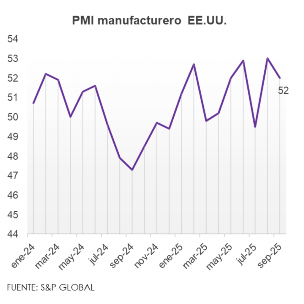 La actividad manufacturera en Estados Unidos (EE.UU.) mantuvo en septiembre su crecimiento, aunque a un ritmo más débil que en meses anteriores. El índice PMI manufacturero de S&P Global se ubicó en 52 puntos, por debajo de los 53 de agosto, lo que refleja una expansión más moderada del sector.