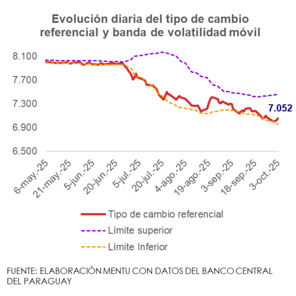 En los primeros días de octubre se registró un leve repunte del tipo de cambio, con rendimientos diarios positivos hasta el cierre semanal. Cabe señalar que el viernes 3 se observó la mayor variación, con una depreciación diaria del 0,4%, que ubicó a la cotización a PYG 7.052/USD.
