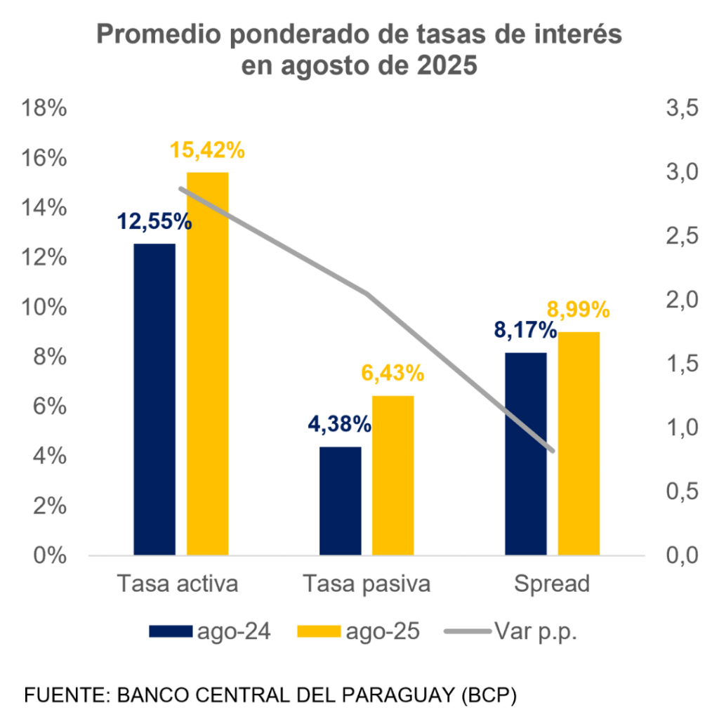 En agosto, el promedio ponderado de tasas activas bancarias para operaciones en guaraníes disminuyó a 15,42%, aumentando 2,8 puntos porcentuales (p.p.) en forma interanual. Por su parte, la tasa pasiva en MN se situó en 6,53%, menor a la tasa registrada el mes anterior en 0,36 pp,  mayor al dato de agosto de 2024 en 2,05 pp.