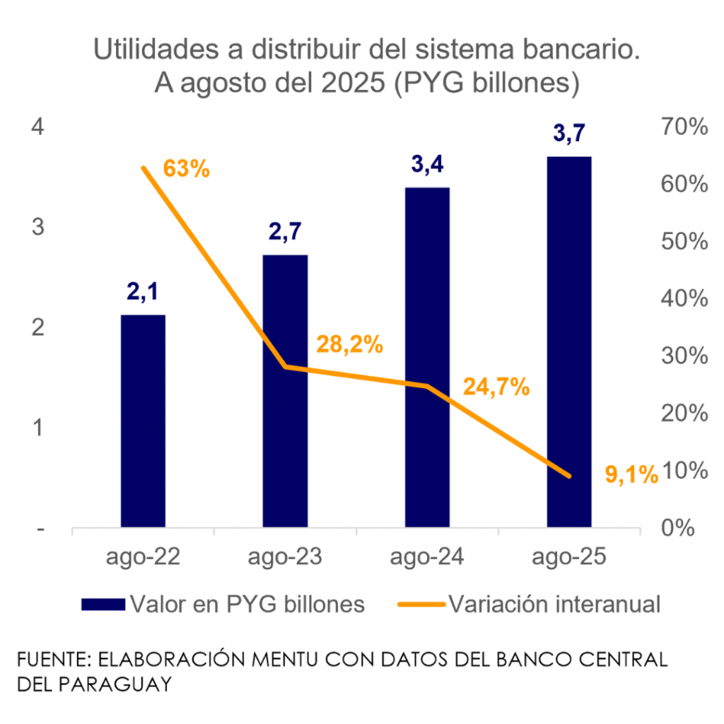 Las utilidades del sistema bancario sumaron al mes de agosto del corriente año PYG 3,7 billones (USD 505 millones), con lo cual su crecimiento interanual subió 9,1%. Este ritmo de crecimiento se consolida como el más alto en el año para las utilidades superando al 8,2% del mes anterior.