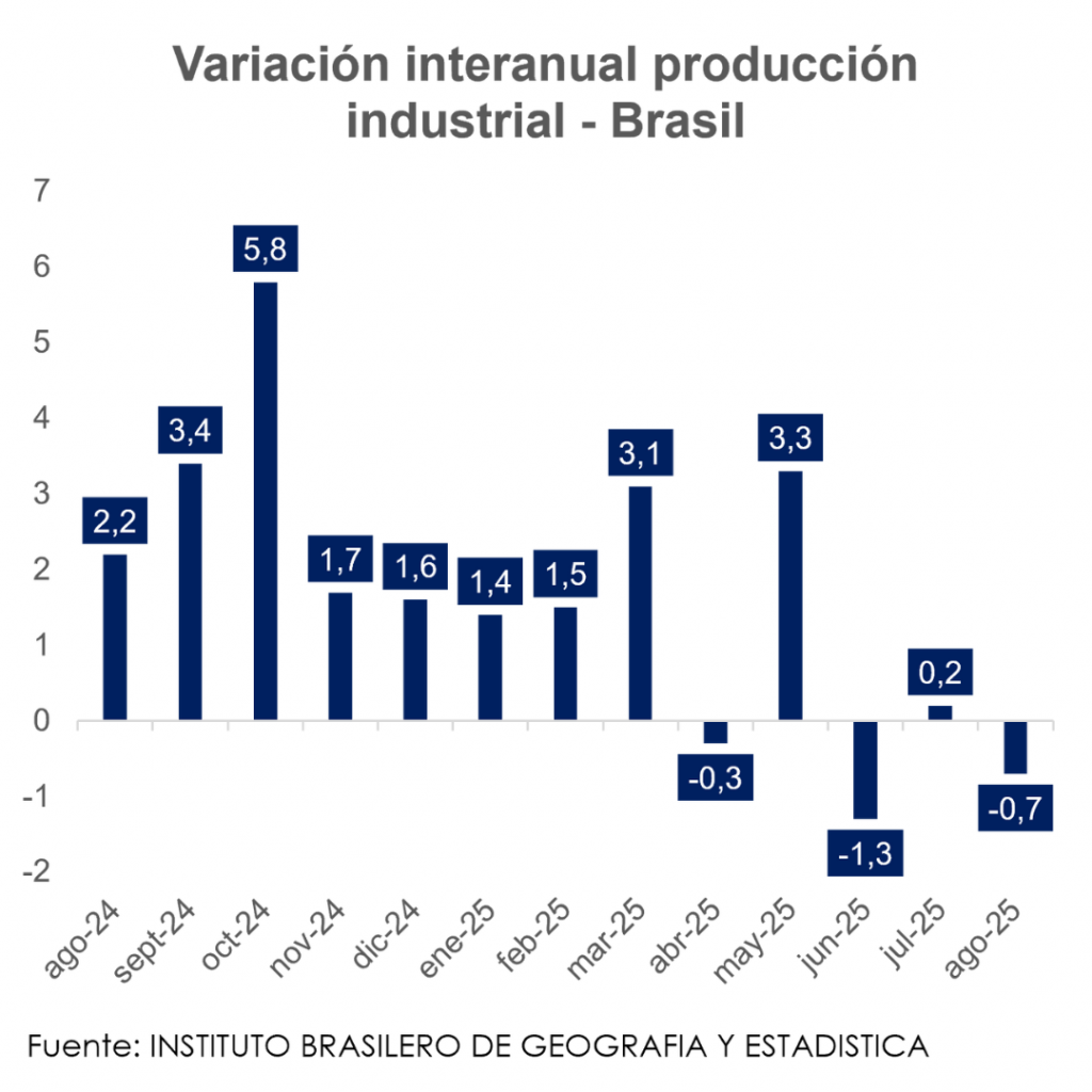 La producción industrial de Brasil aumentó 0,8% en agosto de 2025 respecto a julio, según la serie desestacionalizada, aunque cayó 0,7% frente al mismo mes de 2024. En el acumulado del año, el sector registra un crecimiento de 0,9%, y en los últimos 12 meses, de 1,6%.