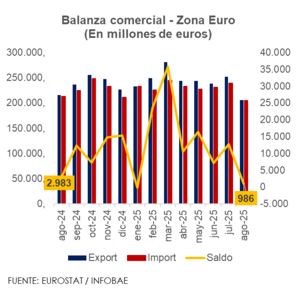El comercio internacional de bienes de la Zona Euro registró en agosto de 2025 un superávit de €1.000 millones, lo que representa una caída del 66,7% interanual y un fuerte retroceso frente a los €12.700 millones de julio, según datos de Eurostat. Las exportaciones totalizaron €205.900 millones, 4,7% menos que en agosto de 2024, mientras que las importaciones descendieron 3,8% a €204.900 millones.