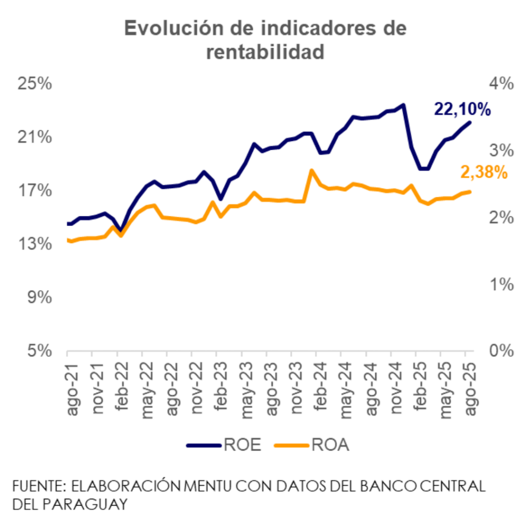 Si bien las utilidades bancarias al mes de agosto de 2025 aumentaron un 9,6%, es importante analizar la dinámica de los indicadores de rentabilidad y eficiencia. Estos ofrecen información útil sobre las condiciones en que se generan las utilidades.