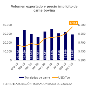En septiembre, las exportaciones de productos bovinos alcanzaron 29.207 toneladas, lo que representa una contracción de 10,2% respecto a septiembre del 2024. El valor de las exportaciones alcanzó USD 179,3 millones, incrementándose en 19,8% con respecto al mismo mes del año pasado. El precio implícito se ubicó en USD 6.144/ton, superior en USD 1.170/ton al registrado un año atrás.