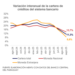 El saldo de la cartera de créditos del sistema bancario al mes de septiembre del 2025 fue de PYG 179,4 billones (USD 25,6 mil millones) y creció 11,3% interanualmente. La evolución del saldo crediticio muestra un comportamiento normal y cíclico, que estaría entrando en fase de menor ritmo de crecimiento.