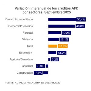 La Agencia Financiera de Desarrollo (AFD) desembolsó PYG 212 millones (USD 29 millones) para créditos en el mes de septiembre. De esta manera el acumulado al tercer trimestre sumó PYG 2,1 billones (USD 268 millones), siendo 54,4% mayor interanualmente.