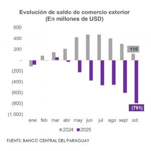 Como resultado de estas variaciones, el comercio exterior acumuló un déficit de USD 791,1 millones al décimo mes del 2025, en contraste con el superávit de USD 116 millones logrado en el mismo periodo del 2024.