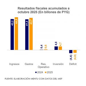 El acumulado de esta última ascendió a PYG 4,7 billones, mostrando una caída interanual de 1,8% y, por primera vez en el año, un nivel inferior al del mismo periodo del 2024. Esto se alinea a la desaceleración observada en las variaciones mensuales, pese a lo cual el déficit se ubica en PYG 4,0 billones.