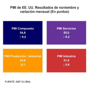 La actividad empresarial en EE.UU. volvió a acelerarse en noviembre, con el Índice de Gestores de Compras PMI compuesto subiendo a 54,8 desde 54,6, impulsado por el desempeño de los servicios.