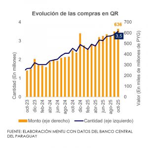 El número de compras a través de la modalidad QR alcanzó 3,5 millones en el mes de octubre, con un valor de PYG 636 mil millones (USD 89 millones). De esta manera, la cantidad de operaciones se incrementó 34,8% interanualmente, mientras que el valor fue 46,6% superior al del mismo mes del 2024.