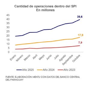En del Sistema de Pagos Instantáneos (SPI) se realizaron unas 39,6 millones de transferencias en el mes de octubre, por un total de PYG 13,7 billones (USD.1,9 mil millones). La cantidad de transacciones es 2,1 veces mayor interanualmente y el valor 1,6 veces, manteniendo una tendencia de crecimiento.