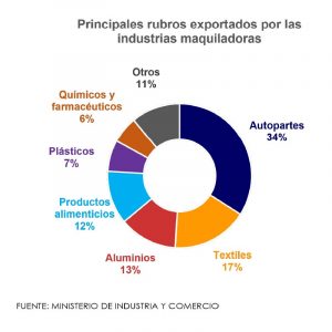 Los principales rubros exportados por las maquiladoras fueron autopartes (34%), confecciones y textiles (17%), aluminios (13%), productos alimenticios (12%) y plásticos (7%), concentrando el 83% de los envíos.