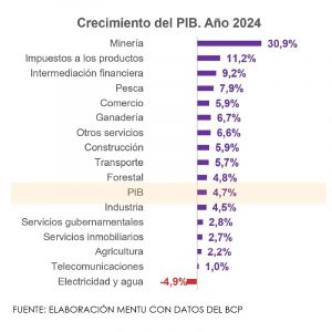 La economía de Paraguay creció 4,7% en el 2024, lo que implica un ajuste de 0,5 puntos porcentuales (p.p.) desde la estimación anterior. Analizando la producción, el sector primario aportó con aumentos en agricultura (2,2%), ganadería (6,7%) y forestal (4,8%).