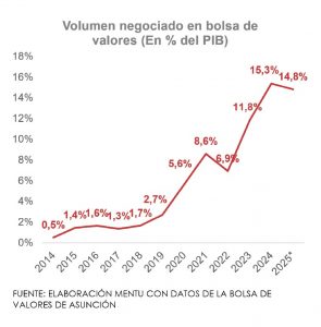 En el acumulado hasta el penúltimo mes del año, el volumen negociado llegó a PYG 54,1 billones (USD 7,7 mil millones), registrando un crecimiento interanual de 21%. Este monto equivale al 14,8% del PIB corriente proyectado para el 2025 y muestra una relativa mayor profundización del mercado bursátil paraguayo y el fortalecimiento de su rol como canal para el financiamiento y la inversión.