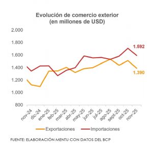 Con esto, el resultado acumulado a noviembre fue deficitario de USD 1.031 millones, evidenciando que el avance de las importaciones superó al dinamismo exportador por octava ocasión en el año.