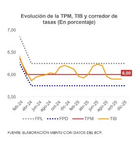 En el plano externo, consideró que la Reserva Federal de Estados Unidos redujo en diciembre el rango objetivo de la tasa de fondos federales y el mercado prevé nuevos recortes en 2026, mientras que la inflación interanual descendió a 2,7% en noviembre,.