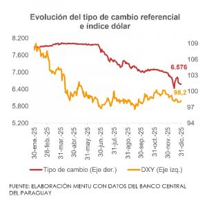 El tipo de cambio referencial del guaraní con respecto al dólar cerró el año 2025 en PYG 6.576/USD, nivel que representa una apreciación de 16% de la moneda nacional con respecto al cierre del año previo.