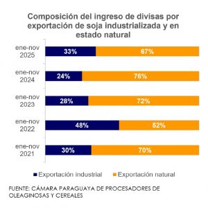 La industrialización de oleaginosas alcanzó 3,3 millones toneladas a noviembre del 2025 lo que significa un incremento interanual de 23,3%. La soja explicó el 98% de dicho volumen, con 3,2 millones de toneladas procesadas, es decir, 24,2% más que lo registrado en el mismo periodo del año anterior.