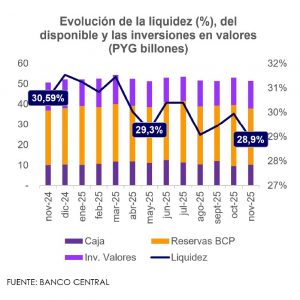 En noviembre pasado, la liquidez del sistema bancario fue de 28,9%, considerando el ratio entre la suma del disponible más las inversiones y los depósitos, y se redujo 1 punto porcentual (p.p.) en relación al mes anterior y 1,7 p,p. en términos interanuales. Esto último significa una menor disponibilidad en comparación a noviembre del 2024.