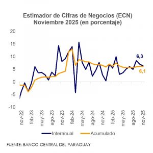 El Estimador de Cifras de Negocios (ECN) mantuvo un desempeño positivo en noviembre, reflejando la expansión sostenida en comercio, servicios y manufacturas en Paraguay.