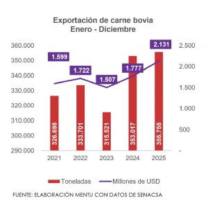 El precio promedio de exportación durante 2025 se situó en USD 6.017,5 por tonelada, registrando un incremento interanual del 20% respecto al acumulado de 2024. Este desempeño estuvo impulsado por la valorización de la carne bovina en los mercados internacionales.