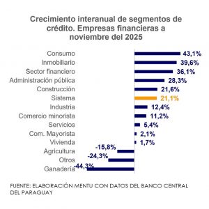 El saldo crediticio de las empresas financieras a noviembre de 2025 fue de PYG 4,3 billones, registrando un incremento interanual de 21,1%, indicando que el crédito mantiene una trayectoria expansiva, aunque con señales de desaceleración ya que se encuentra por debajo del promedio trimestral
