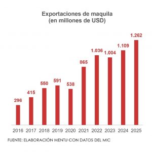 Durante el año 2025, el régimen de maquila registró exportaciones por 1.262 USD millones y representó el 70% de las exportaciones de manufacturas de origen industrial del país. Asimismo, lo exportado fue 13,8% superior a los USD 1.109 millones exportados en el 2024, registrando así un récord en los envíos de este régimen.