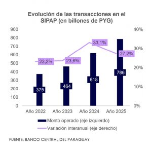 En el Sistema de Pagos del Paraguay (SIPAP), se registró en diciembre del 2025 un total de 47,1 millones de transferencias, correspondiente a un valor de PYG 84,4 billones (USD 12,8 mil millones). Estas operaciones crecieron en 24,3% interanual mientras que el valor duplicaron su valor de un año.