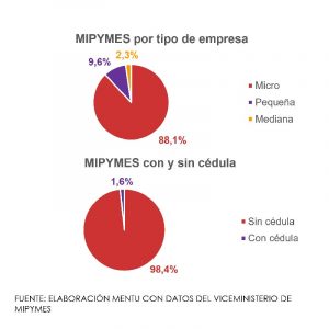 Según el último informe publicado por el Viceministerio de Mipymes, en el país existirían unas 450.000 unidades empresariales de tamaño micro, pequeño y mediano. Las microempresas concentran la mayor parte de las mismas con 396.407 unidades, abarcando el 88,1% de las Mipymes. Le siguen las pequeñas empresas (9,6%) y las medianas empresas (2,3%).
