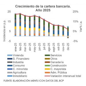 Al cierre del mes de diciembre del 2025, el saldo de la cartera de créditos se incrementó interanualmente 6,9%, alcanzando un total de PYG 183 billones (USD 27,8 mil millones)