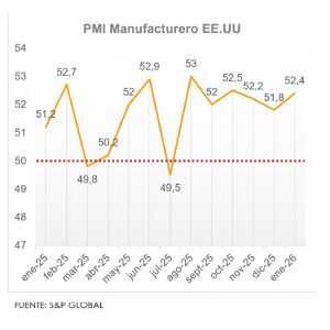 La actividad manufacturera de Estados Unidos mejoró en enero de 2026, según el Índice de Gestores de Compras (PMI) elaborado por S&P Global, que subió a 52,4 puntos desde 51,8 en diciembre, señalando una expansión moderada del sector. Este es uno de los mayores avances desde mayo de 2022 y estuvo impulsado por la acumulación de inventarios, ya que el crecimiento de los nuevos pedidos fue limitado.