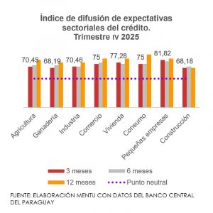 La Encuesta General de Créditos reveló un escenario favorable para el sistema financiero al cierre del cuarto trimestre de 2025. Los índices de expectativas sectoriales para 3, 6 y 12 meses se ubicaron por encima de la zona de optimismo.
