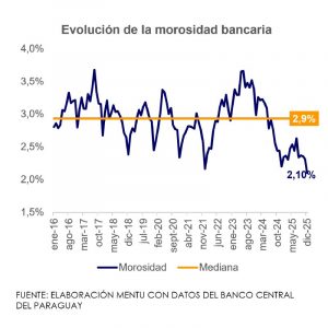 La cartera bancaria morosa representó 2,1% de la cartera total al cierre de diciembre del 2025, con lo cual se ubicó por debajo de la mediana histórica. Esto significó una disminución interanual de 0,1 puntos porcentuales (p.p.) anuales de la tasa de morosidad.