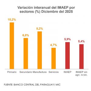 El Indicador Mensual de Actividad Económica del Paraguay (IMAEP) aumentó 5,9% interanualmente en diciembre de 2025, completando doce meses consecutivos de expansión interanual y acumulando un crecimiento de 6,0%. Excluyendo la agricultura y las binacionales subió 5,4%.