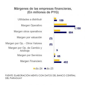 En conjunto, las cuatro entidades que actualmente operan en el sistema de financieras obtuvieron utilidades por PYG 159 mil millones al cierre del 2025 (USD 24 millones), lo que significó un incremento interanual de 42,7%.