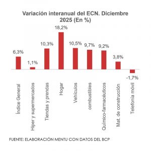 Por componentes, el mayor aumento interanual se observó en las ventas de equipamientos para el hogar, que con 18,2% de variación se consolidó como la subrama comercial más dinámica del 2025. Le siguieron la de venta y mantenimiento de vehículos, con 10,5%, grandes tiendas y prendas con 10,3%, combustibles, con 9,7% y productos químico-farmacéuticos, con 9,2%. Las ventas de materiales de construcción crecieron 3,8%.