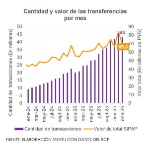 A través del Sistema de Pagos del Paraguay (SIPAP), se realizaron 43 millones de transferencias en el primer mes del 2026, por un valor total de PYG 69,3 billones (USD 10 mil millones). La cantidad de operaciones se cuadruplicó con respecto a enero del año pasado y el valor aumentó 24% interanualmente.