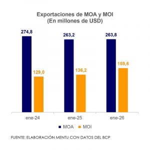 En el primer mes del 2026, las exportaciones de manufacturas ascendieron a USD 423,3 millones y crecieron 6,0% respecto a enero del año pasado, con una participación de 50,1% en las exportaciones totales.