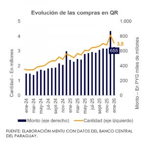 En enero del corriente año se realizaron 3,5 millones de compras por medio de la modalidad de QRs registradas en el Sistema de Pagos del Paraguay (SIPAP), con un valor total de PYG 655 mil millones (USD 98 millones). De esta manera, la cantidad aumentó 32,1% en forma interanual, mientras que el valor se incrementó 36,6%.