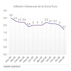 La inflación anual en la Zona Euro se ubicó en 1,7% en enero, por debajo del 2,0% registrado en diciembre, según informó Eurostat, evidenciando que si bien los precios siguen aumentando, lo hacen a un ritmo más lento que en meses anteriores. En enero de 2025 la inflación interanual había sido de 2,5%, lo que confirma una tendencia descendente en el último año.