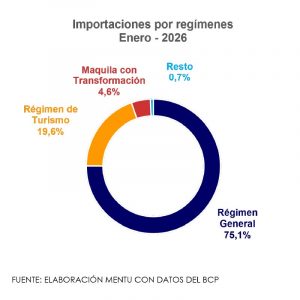 En enero, las imortaciones registradas alcanzaron USD.1.412,6 millones, aumentando 1,5% frente a los USD 1.391,3 millones de enero de 2025. El régimen general, que concentra la mayor proporción del total, sumó USD 1.060,7 millones, con una leve caída de 0,9%. En contraste, las importaciones bajo el Régimen de Turismo crecieron 9,6%, hasta USD 276,7 millones.