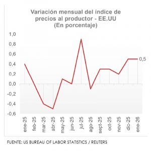 Los precios al productor en Estados Unidos registraron en enero su mayor avance en meses, reforzando las señales de presiones inflacionarias persistentes. El Índice de Precios al Productor (IPP) subió 0,5% mensual, por encima del 0,3% previsto por economistas, tras un aumento revisado de 0,4% en diciembre, informó el Departamento de Trabajo.