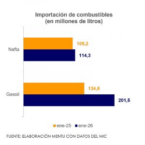 En enero del 2026 se importaron 315,9 millones de litros de combustible, nivel 29,6% mayor en términos interanuales. El gasoil concentró el 64% de las compras externas de combustible con 201,5 millones de litros y un aumento interanual de 49,7%. El resto correspondió a naftas, que en conjunto sumaron 114,3 millones de litros, con un crecimiento más moderado de 4,8%.