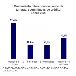 La cantidad de tarjetas de crédito activas se situó en 2,5 millones en enero, lo que representa un aumento interanual de 12,6%, mientras que el saldo total de estas alcanzó los PYG 6,1 billones (USD 915 millones), con un incremento de 31,1% respecto a enero de 2025.