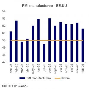 La actividad manufacturera de Estados Unidos continuó creciendo en febrero de 2026, aunque al ritmo más débil en siete meses. El índice PMI de S&P Global se ubicó en 51,6, por debajo del 52,4 de enero, manteniéndose aún en zona de expansión.