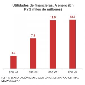 Las utilidades del sistema de financieras, conformado por FIC, Tu Financiera, Finlatina y Financiera Paraguayo-Japonesa, ascendieron a PYG 12,7 mil millones (USD 1,9 millones) en enero y tuvieron incremento interanual de 1,1%, inferior al de 60% registrado en enero del 2025